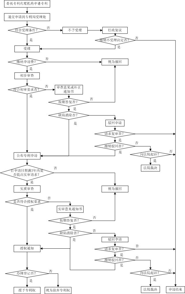 1、国内专利申请所需文件及资料 申请发明专利的,申请文件应当包括:发明专利请求书、说明书(必要时应当有附图)、权利要求书、摘要及其附图,各一式两份。涉及氨基酸或者核苷酸序列 的发明专利申请,说明书中应包括该序列表,并把该序列表作为说明书的一个单独部分提交,同时还应提交符合国家知识产权局规定的记载有该序列表的光盘或软 盘。 申请实用新型专利的,申请文件应当包括:实用新型专利请求书、说明书、说明书附图、权利要求书、摘要及其附图,各一式两份。 申请外观设计专利的,申请文件应当包括:外观设计专利请求书、图片或者照片,各一式两份。要求保护色彩的,还应当提交彩色图片或者照片一式两份。提交 图片的,两份均应为图片,提交照片的,两份均应为照片,不得将图片或照片混用。如对图片或照片需要说明的,应当提交外观设计简要说明,一式两份。 2、如何撰写技术交底书 一份技术交底书,清楚地描述该发明的技术方案和构思,可按下述八个部分撰写: 1)名称; 2)技术领域; 3)现有技术:引证与发明或实用新型专利申请最接近的现有技术文件,并客观指出背景技术中存在的问题和缺点; 4)目的:应针对背景技术中存在的问题,写明由该申请的说明书所公开的技术方案所能解决的技术问题; 5)技术方案及发明要点:写明申请人对其要解决的技术问题所采取的技术措施的集合,是该发明或实用新型申请的核心部分; 6)有益效果:有根据地写明由本发明或实用新型的技术特征带来的,或者是由所述的技术特征必然产生的与现有技术相比所具有的有益效果; 7)附图及其简要说明; 8)实现发明或实用新型的最好方式:详细描述实施本发明或者实用新型的具体例子,尤其应对本发明和实用新型区别于现有技术的技术特征及附加技术特征进行足够详细的描述。 3、国内专利申请业务流程图